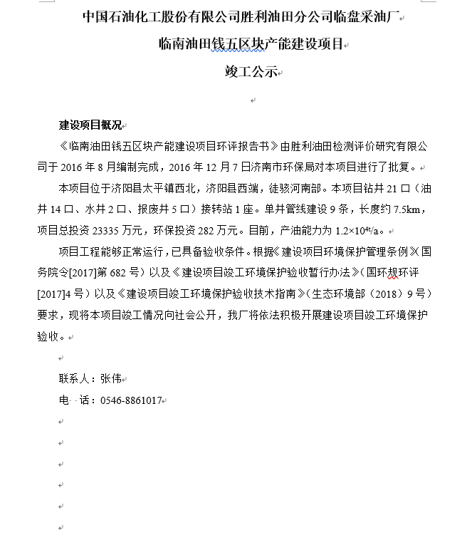 中國(guó)石油化工股份有限公司勝利油田分公司臨盤(pán)采油廠臨南油田錢(qián)五區(qū)塊產(chǎn)能建設(shè)項(xiàng)目竣工公示